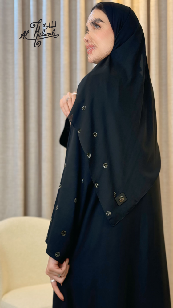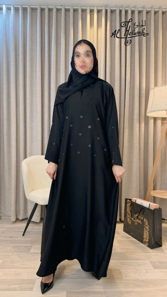 عباءة كريب برسمات كرستال سوارفسكي منثر على الصدر والاكمام بديزاينات ناعم ومتناسقة