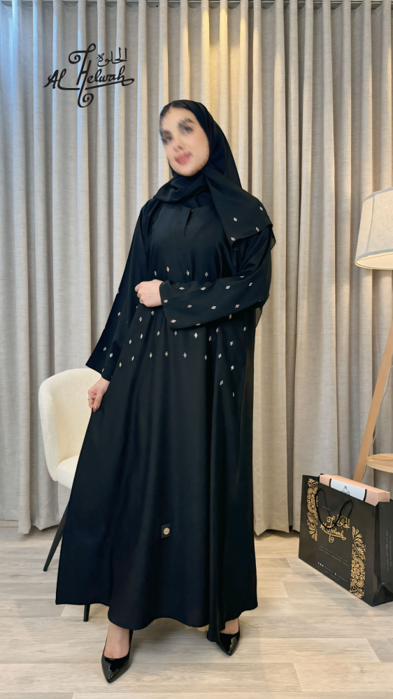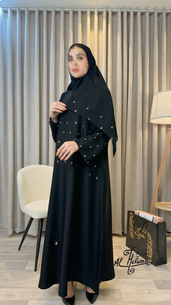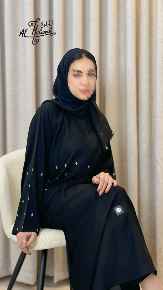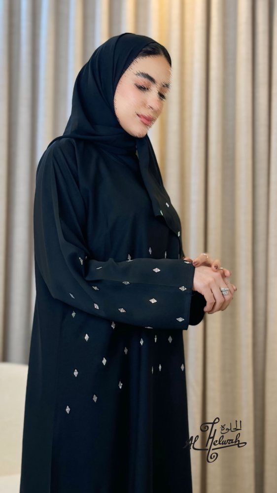 عباءة كريب برسمات كرستال سوارفسكي منثر على الصدر والاكمام بديزاينات ناعم ومتناسقة